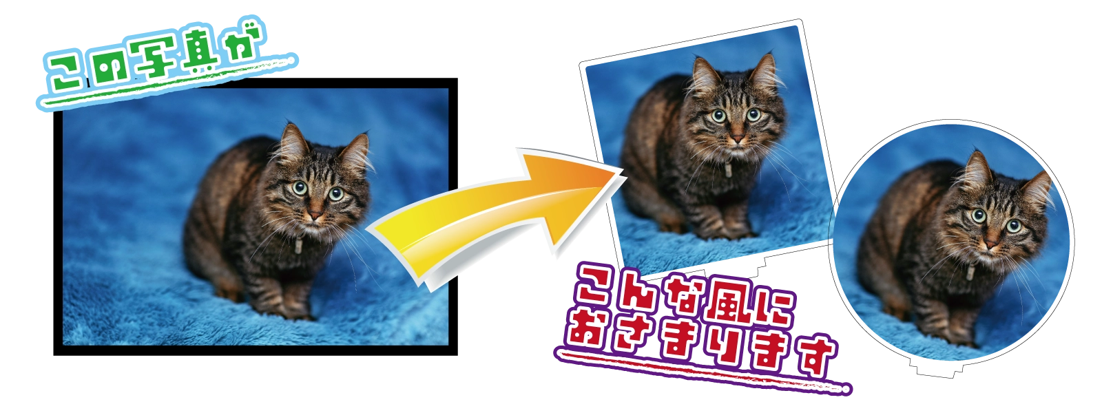 大人気のアクリルスタンドが、たったの1個だけでも格安で製作いたします。円形・正方形・ハート型などの定型タイプから、お好きなラインにカットできるフリーカットタイプまで、形も充実!