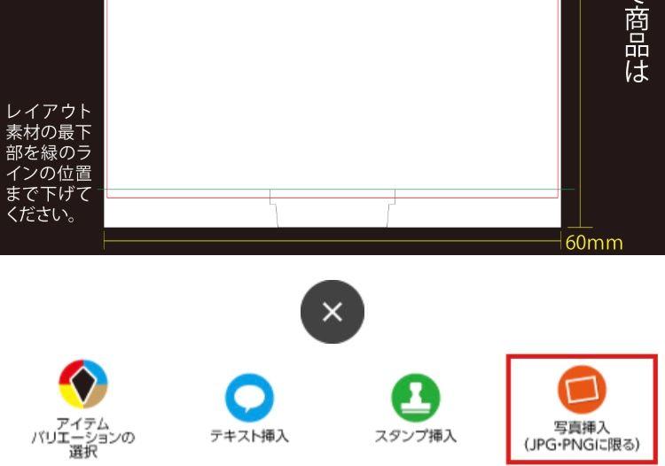 アクスタ 商品ページからシミュレーターを起動したら、画面右下の「写真挿入」をタップして、スマートフォンのカメラロールやフォルダから画像を選びます。