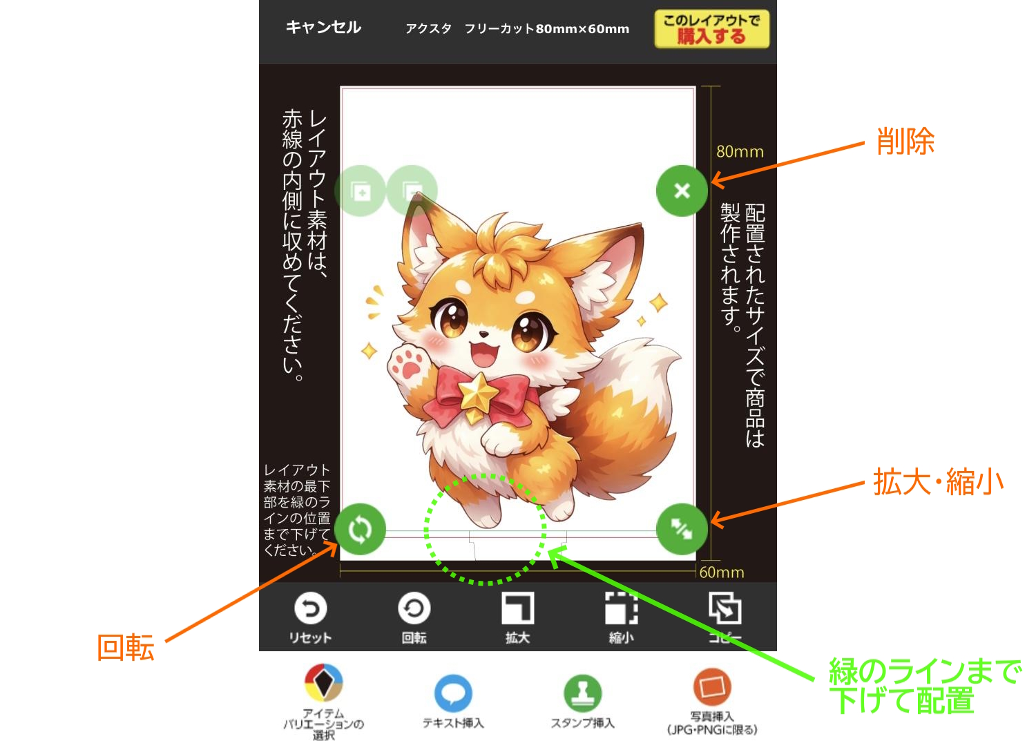 画像の大きさ、位置、向きを調整します。文字やスタンプを追加することもできます。